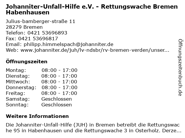 Branchen & Suchbegriffe zu Johanniter-Unfall-Hilfe e.V. - Rettungswache Bremen Habenhausen:e.v., gemeinnützige organisation, habenhausen, hilfe, hilfsorganisation, johanniter, rettungswache, sozialarbeit, unfall, verband, wohlfahrtseinrichtung |