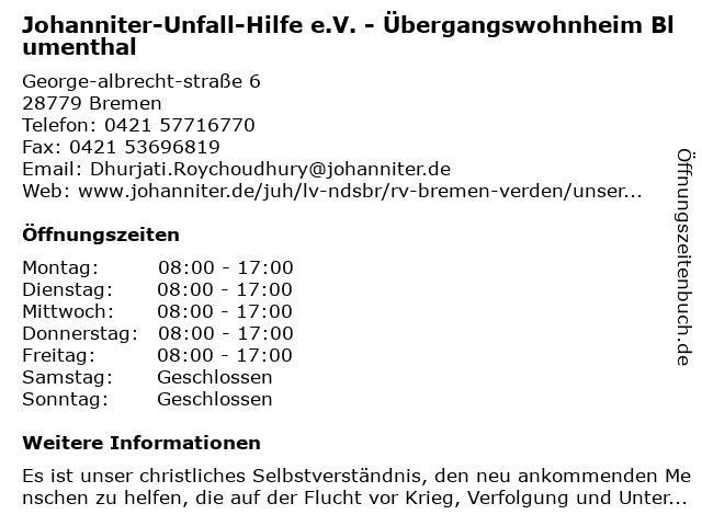Branchen & Suchbegriffe zu Johanniter-Unfall-Hilfe e.V. - Übergangswohnheim Blumenthal:blumenthal, e.v., gemeinnützige organisation, hilfe, hilfsorganisation, johanniter, unfall, verband, wohlfahrtseinrichtung, übergangswohnheim |