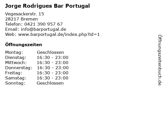 | Öffnungszeiten Jorge Rodrigues Bar Portugal in Bremen anzeigen | |