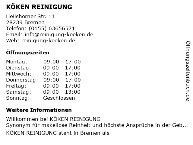 | Öffnungszeiten KÖKEN REINIGUNG in Bremen anzeigen | |
