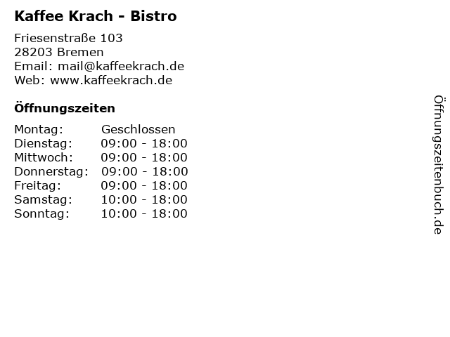 | Öffnungszeiten Kaffee Krach - Bistro in Bremen anzeigen | |
