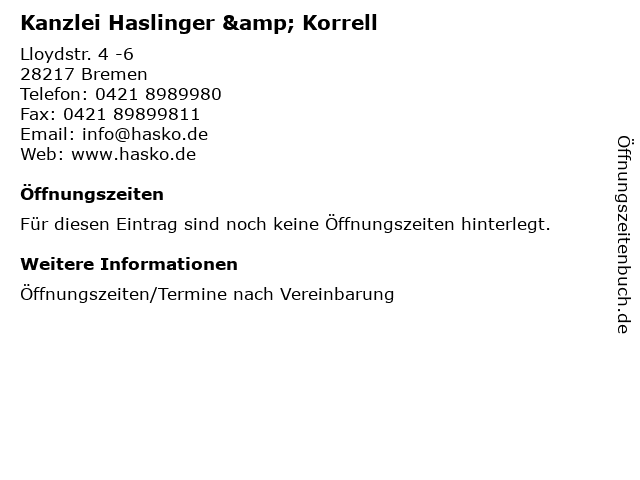 | Öffnungszeiten Kanzlei Haslinger & Korrell in Bremen anzeigen | |