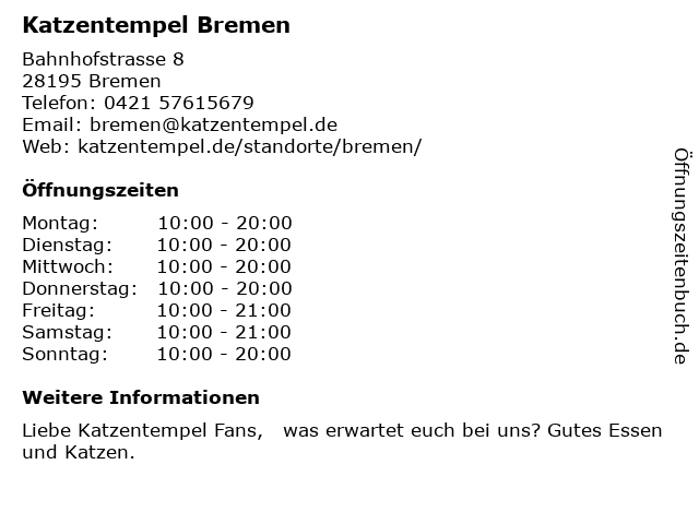| Öffnungszeiten Katzentempel Bremen in Bremen anzeigen | |