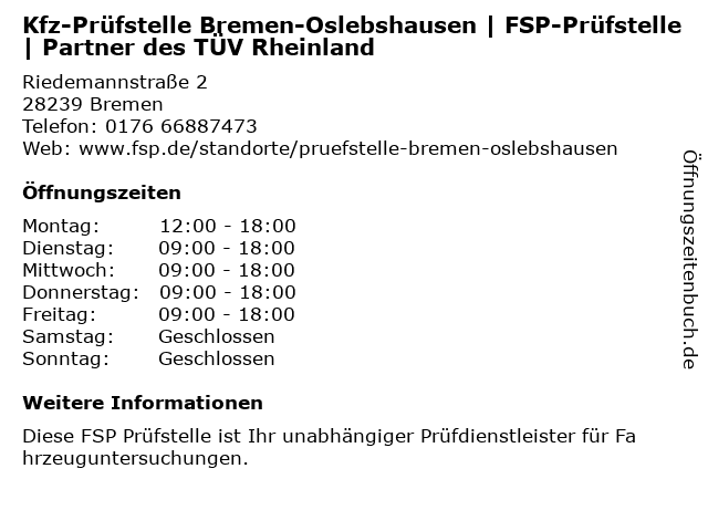 Branchen & Suchbegriffe zu Kfz-Prüfstelle Bremen-Oslebshausen | FSP-Prüfstelle | Partner des TÜV Rheinland:des, fsp, kfz, oslebshausen, partner, prüfstelle, rheinland, tüv |