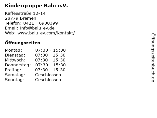 | Öffnungszeiten Kindergruppe Balu e.V. in Bremen anzeigen | |