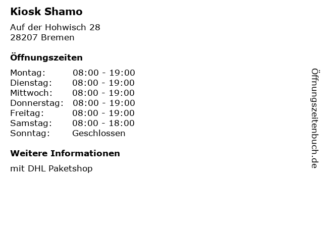 | Öffnungszeiten Kiosk Shamo in Bremen anzeigen | |