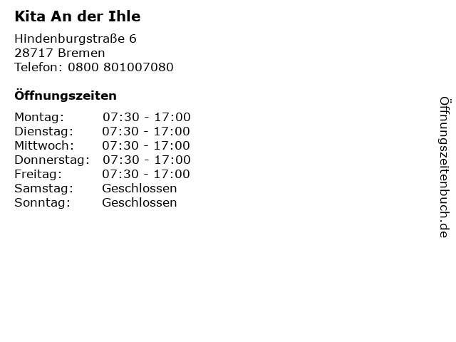 | Öffnungszeiten Kita An der Ihle in Bremen anzeigen | |