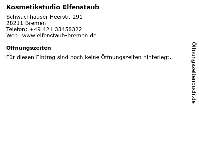 | Öffnungszeiten Kosmetikstudio Elfenstaub in Bremen anzeigen | |