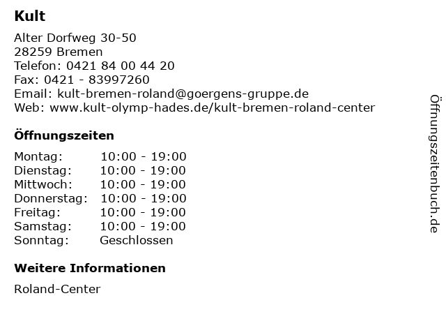 | Öffnungszeiten Kult in Bremen anzeigen | |