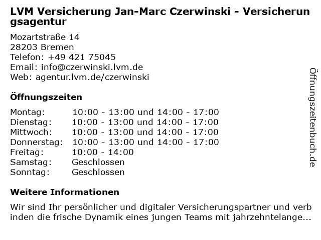 1 LVM Versicherung Kai Franke - Versicherungsagentur (Entfernung: 0,01 km) Mozartstraße 14, 28203 Bremen 3 SIGNAL IDUNA Versicherung Dirk Smula - Versicherungsagentur (Entfernung: 0,65 km) Contrescape 32, 28203 Bremen 6 |