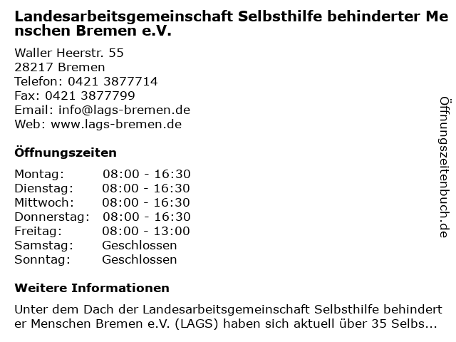 Branchen & Suchbegriffe zu Landesarbeitsgemeinschaft Selbsthilfe behinderter Menschen Bremen e.V.:behinderter, e.v., landesarbeitsgemeinschaft, menschen, selbsthilfe, verband |