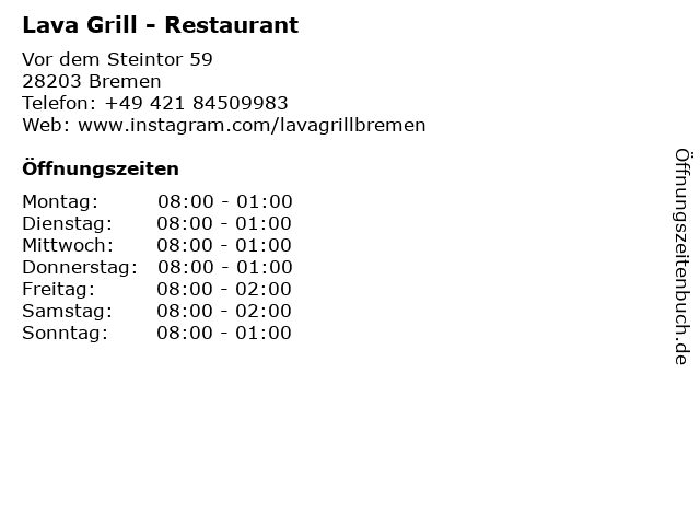 Öffnungszeiten Lava Grill - Restaurant in Bremen anzeigen | |