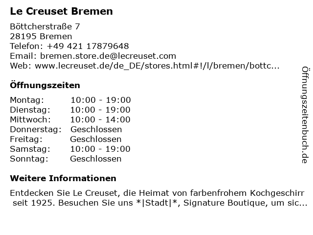 | Öffnungszeiten Le Creuset Bremen in Bremen anzeigen | |