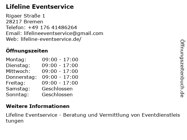 | Öffnungszeiten Lifeline Eventservice in Bremen anzeigen | |