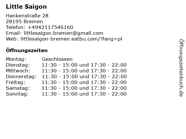 | Öffnungszeiten Little Saigon in Bremen anzeigen | |