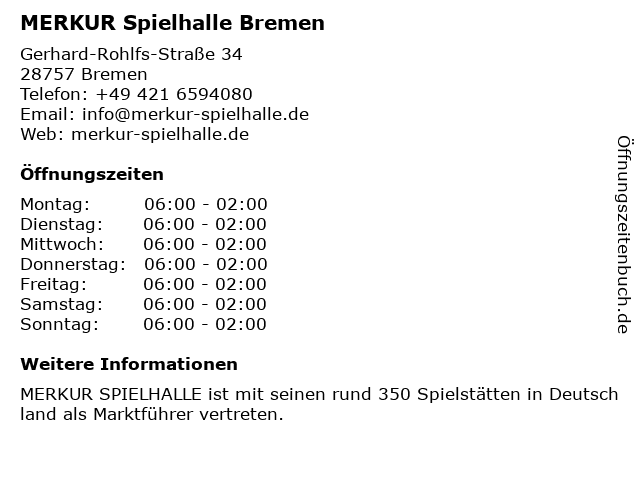 | Öffnungszeiten MERKUR Spielhalle Bremen in Bremen anzeigen | |