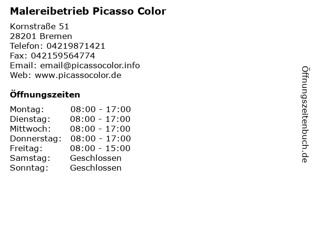 | Öffnungszeiten Malereibetrieb Picasso Color in Bremen anzeigen | |