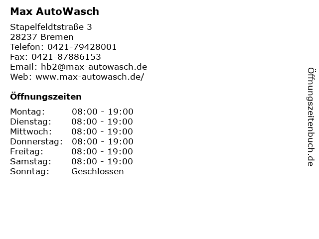 | Öffnungszeiten Max AutoWasch in Bremen anzeigen | |