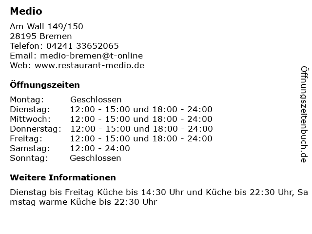 | Öffnungszeiten Medio in Bremen anzeigen | |