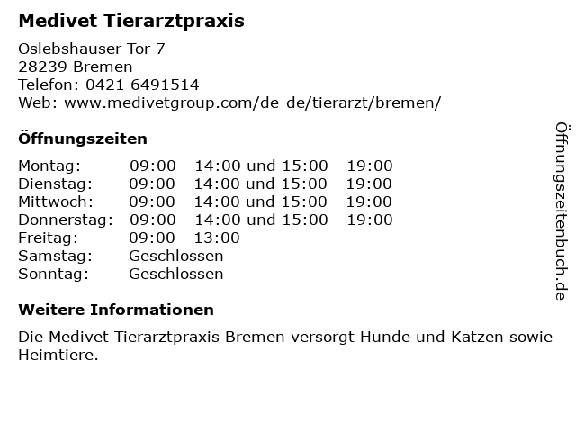 | Öffnungszeiten Medivet Tierarztpraxis in Bremen anzeigen | |