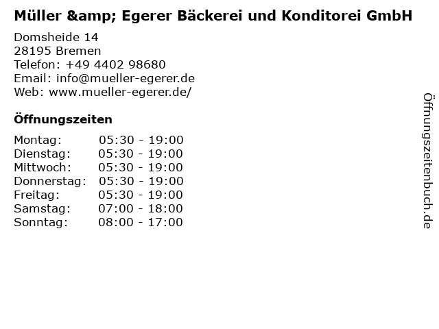 2 Müller & Egerer Bäckerei und Konditorei GmbH (Entfernung: 1,33 km) Friedrich-Ebert-Straße 147A, 28199 Bremen 3 Müller & Egerer Bäckerei und Konditorei GmbH (Entfernung: 1,67 km) Eduard-Schopf-Allee 1, 28209 Bremen 6  |