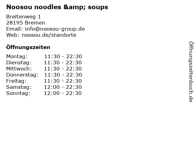 | Öffnungszeiten Noosou noodles & soups in Bremen anzeigen | |