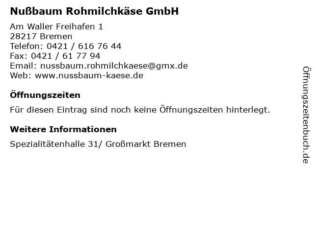 | Öffnungszeiten Nußbaum Rohmilchkäse GmbH in Bremen anzeigen | |