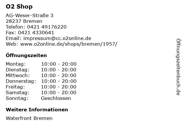 | Öffnungszeiten O2 Shop in Bremen anzeigen | |