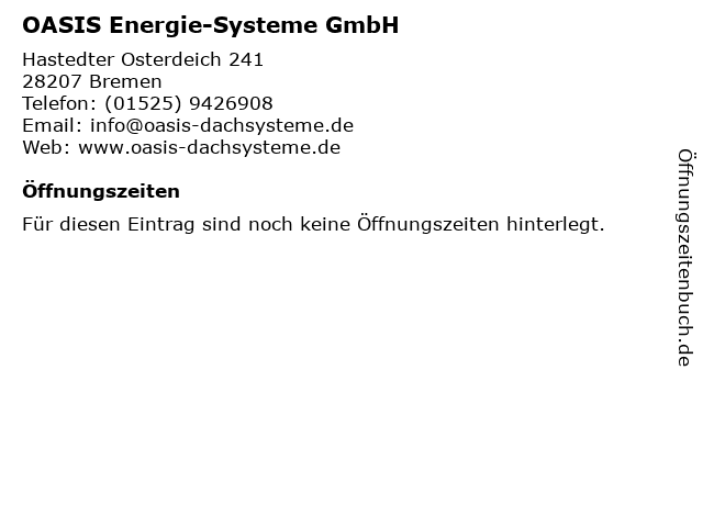 | Öffnungszeiten OASIS Energie-Systeme GmbH in Bremen anzeigen | |