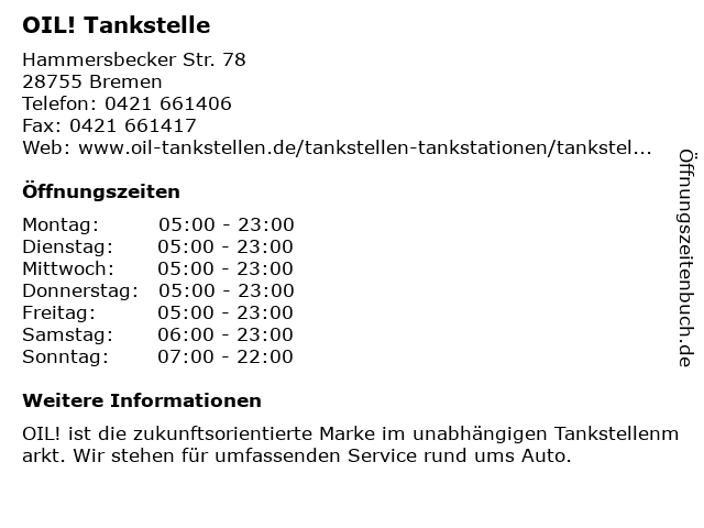 | Öffnungszeiten OIL! Tankstelle in Bremen anzeigen | |