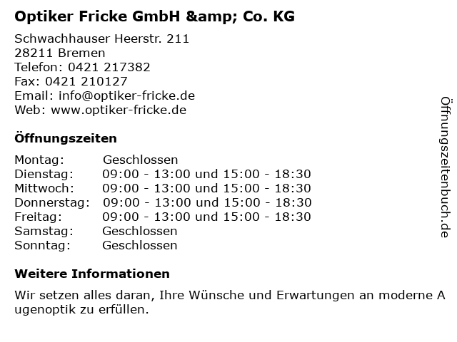 | Öffnungszeiten Optiker Fricke GmbH & Co. KG in Bremen anzeigen | |
