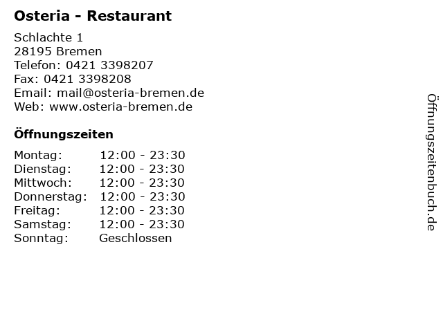 | Öffnungszeiten Osteria - Restaurant in Bremen anzeigen | |