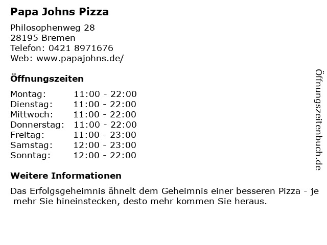 | Öffnungszeiten Papa Johns Pizza in Bremen anzeigen | |