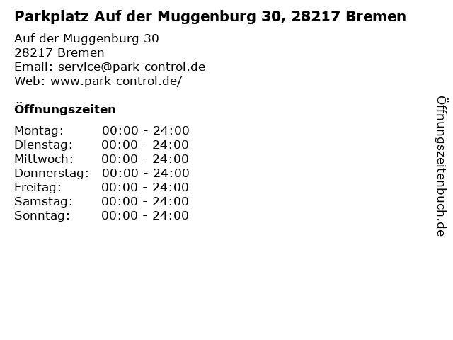 Öffnungszeiten Parkplatz Auf der Muggenburg 30, 28217 Bremen in Bremen anzeigen | |