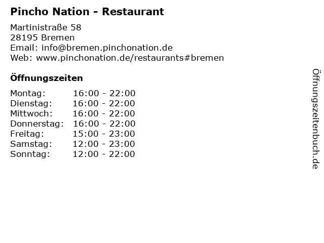 | Öffnungszeiten Pincho Nation - Restaurant in Bremen anzeigen | |