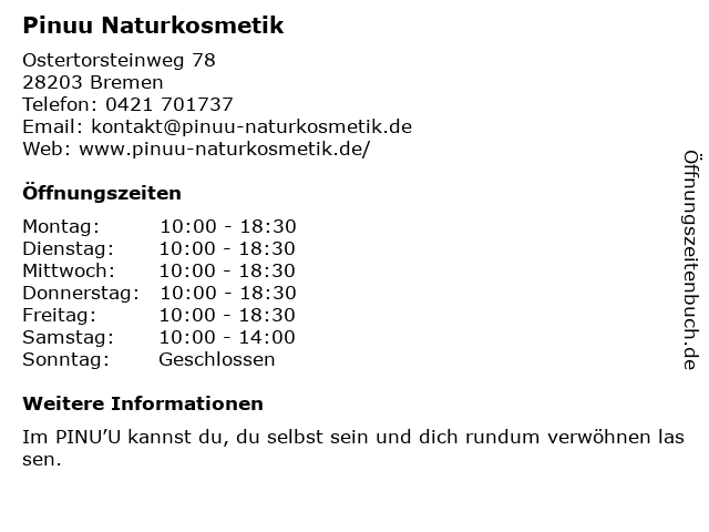 | Öffnungszeiten Pinuu Naturkosmetik in Bremen anzeigen | |
