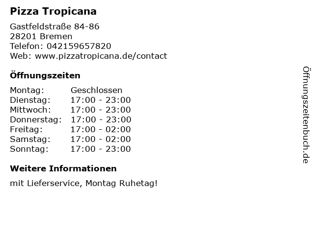 | Öffnungszeiten Pizza Tropicana in Bremen anzeigen | |
