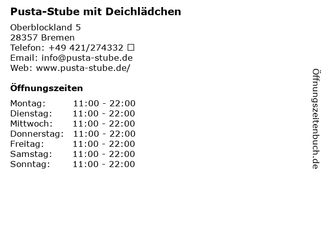 | Öffnungszeiten Pusta-Stube mit Deichlädchen in Bremen anzeigen | |