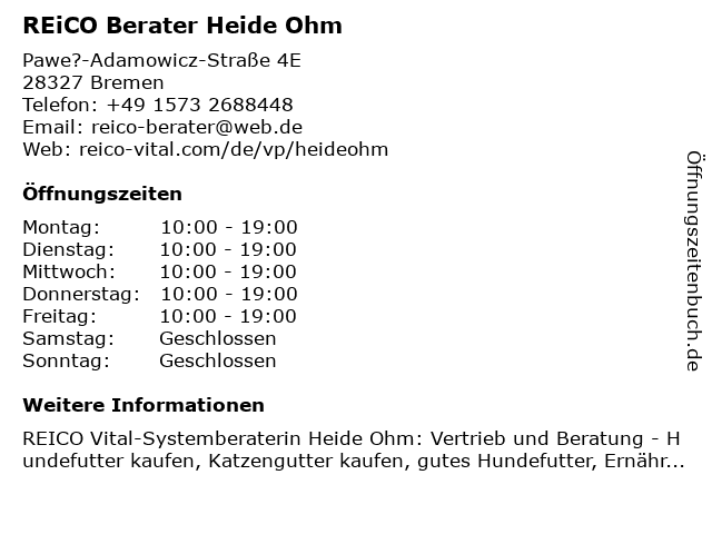 | Öffnungszeiten REiCO Berater Heide Ohm in Bremen anzeigen | |