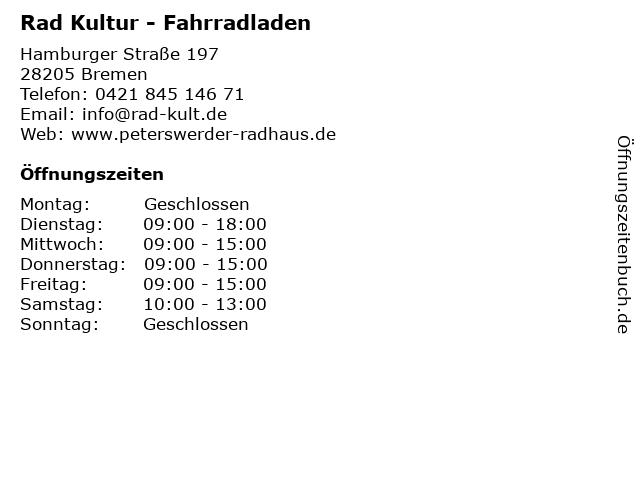 | Öffnungszeiten Rad Kultur - Fahrradladen in Bremen anzeigen | |