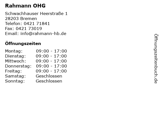| Öffnungszeiten Rahmann OHG in Bremen anzeigen | |
