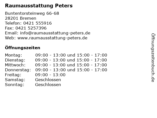 | Öffnungszeiten Raumausstattung Peters in Bremen anzeigen | |