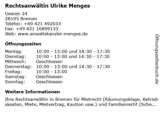 | Öffnungszeiten Rechtsanwältin Ulrike Menges in Bremen anzeigen | |