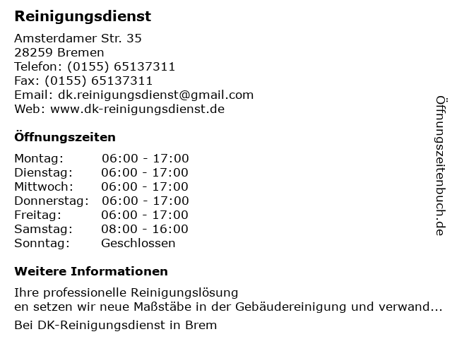| Öffnungszeiten Reinigungsdienst in Bremen anzeigen | |