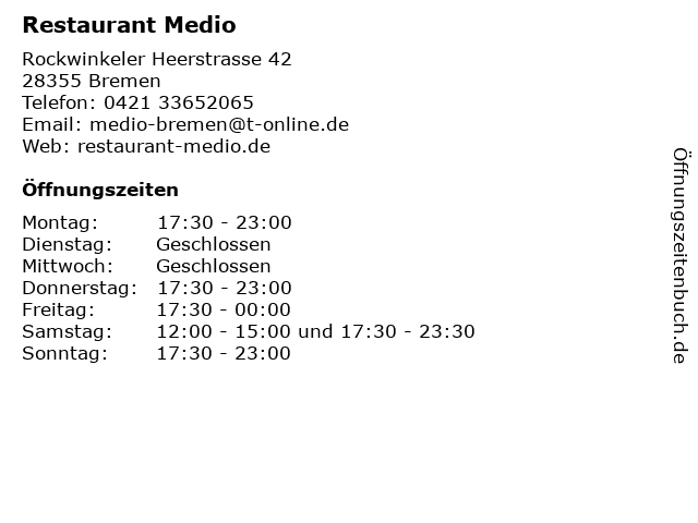| Öffnungszeiten Restaurant Medio in Bremen anzeigen | |