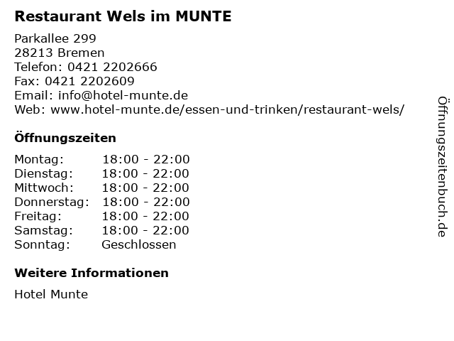 | Öffnungszeiten Restaurant Wels im MUNTE in Bremen anzeigen | |