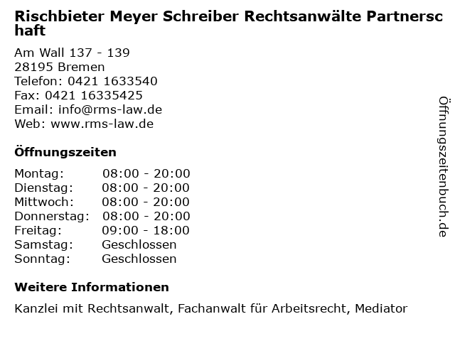 Branchen & Suchbegriffe zu Rischbieter Meyer Schreiber Rechtsanwälte Partnerschaft:a allgemeine stichworte:, abfindung, agb, anlagenbau, anwalt, arbeitsgericht, arbeitsrecht, arbeitsschutz, arbeitssicherheit, attorney, aufhebungsvertrag, auseinandersetzung, branche, gesellschaft, meyer, partnerschaft, rechtsanwälte, rischbieter, schreiber, soziales |