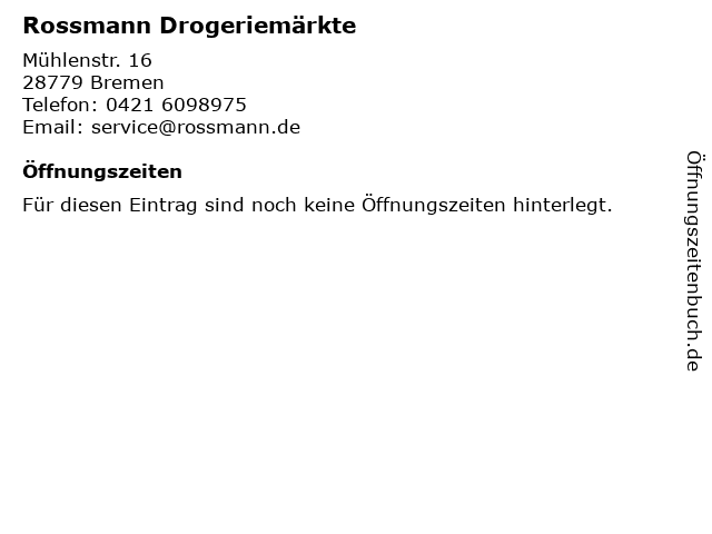 | Öffnungszeiten Rossmann Drogeriemärkte in Bremen anzeigen | |