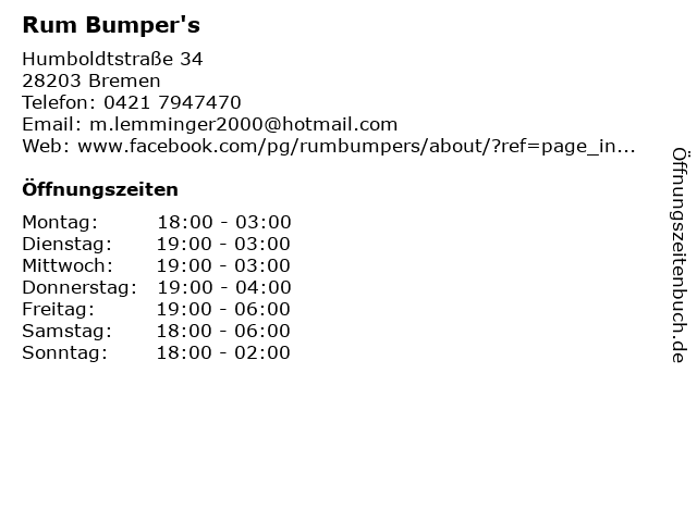 | Öffnungszeiten Rum Bumper's in Bremen anzeigen | |