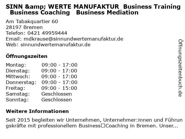Branchen & Suchbegriffe zu SINN & WERTE MANUFAKTUR Business Training Business Coaching Business Mediation:business, coaching , fachschule, manufaktur, mediation, sinn, training , werte, business |